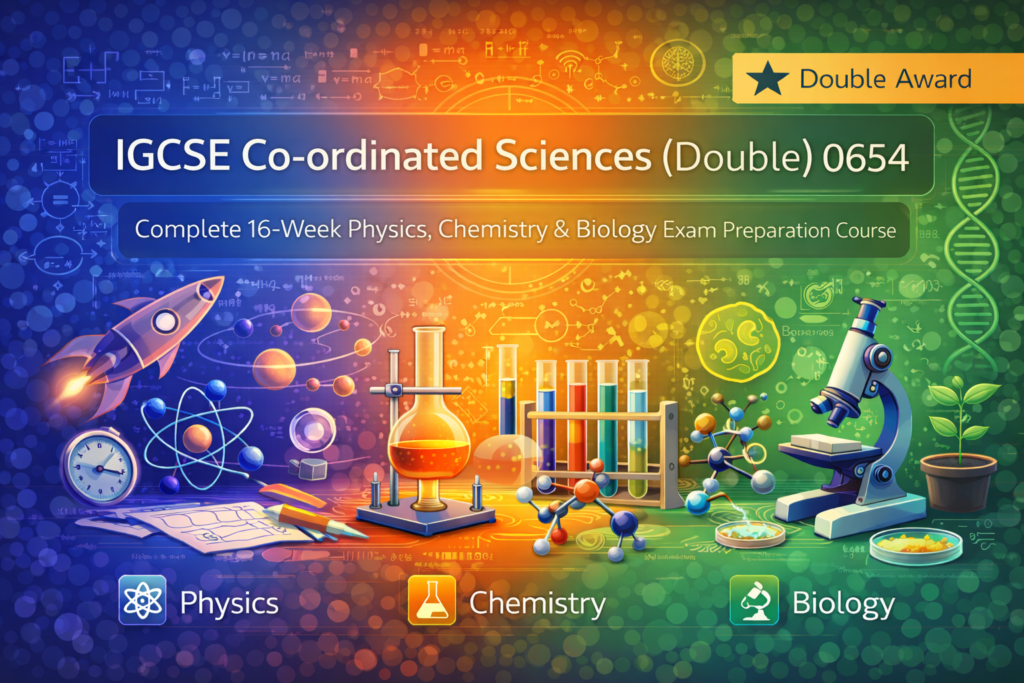This Cambridge IGCSE Sciences – Co-ordinated (Double) (0654) course is a 16-week structured and exam-focused Double Award program, allowing students to achieve two IGCSE grades (A–A to G–G)** through a single, integrated science qualification.