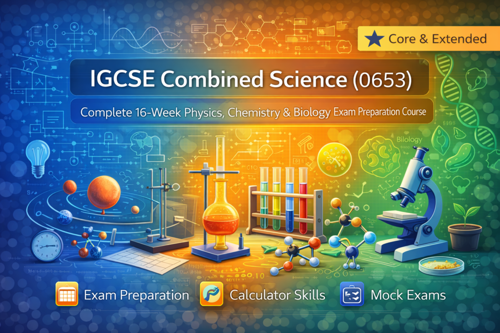 This Cambridge IGCSE Combined Science (0653) course is a 16-week structured and exam-focused program designed to prepare students for Core and Extended pathways, covering Physics, Chemistry, and Biology equally within a single integrated course.